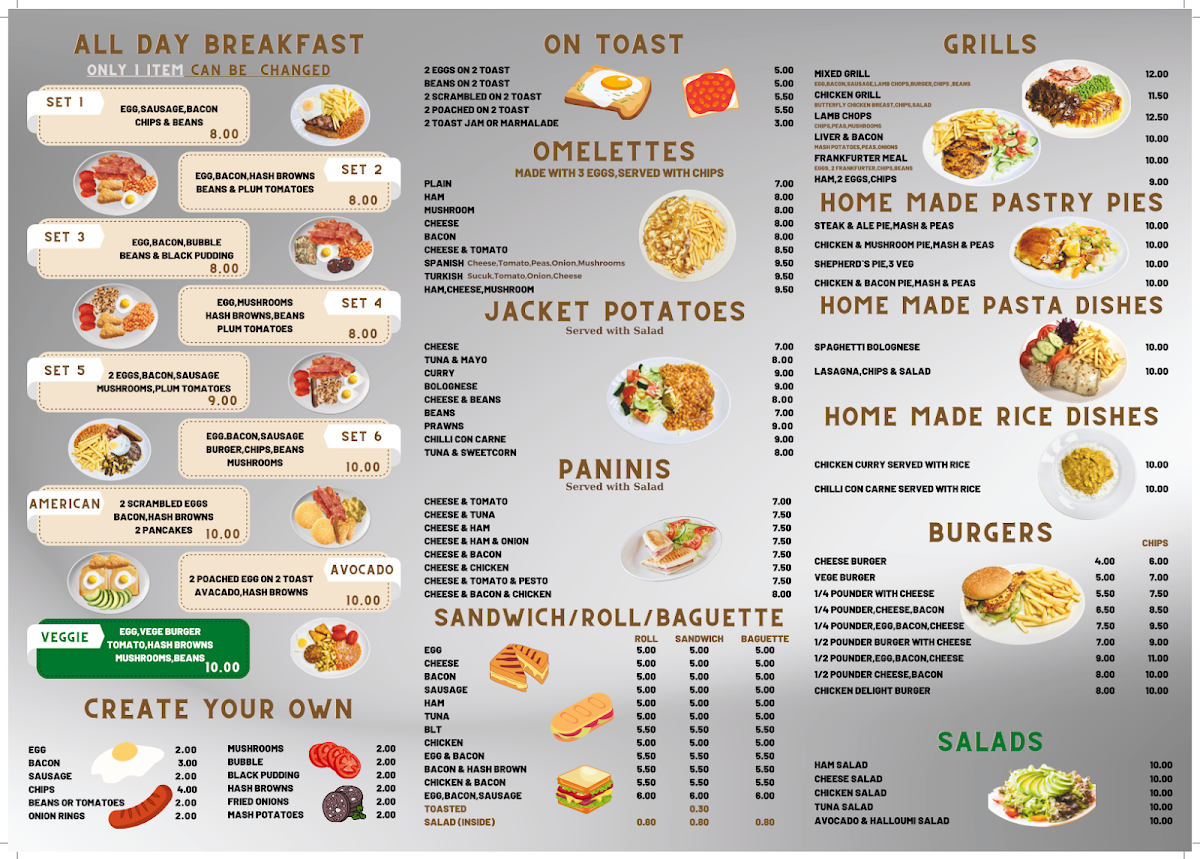 EGG, BACON, SAUSAGE, LAMB CHOPS, BURGER,CHIPS, BEANS